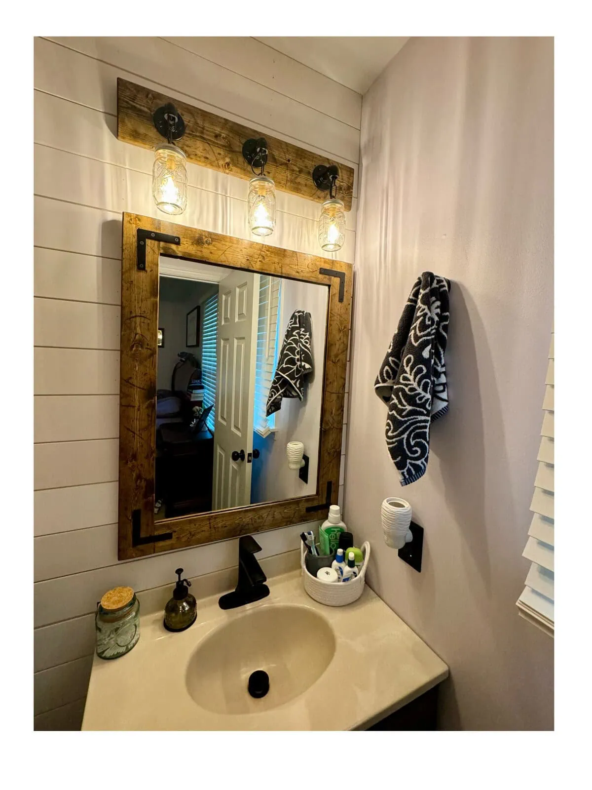 The clear mason jars give our bathroom a bright shine with uniqueness.